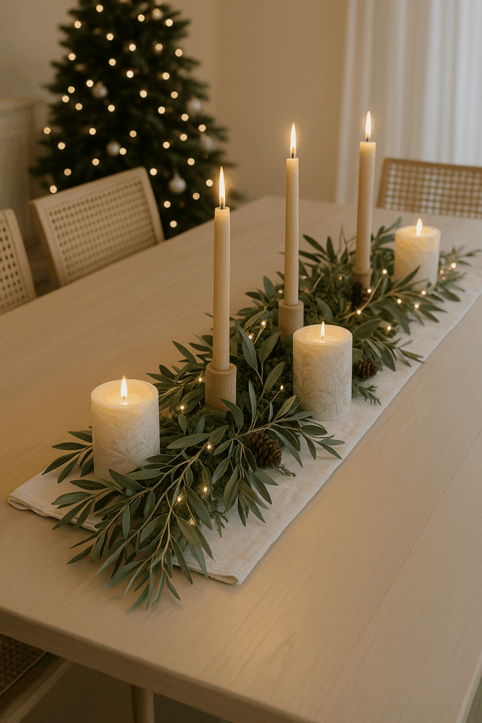 Dekoriere rund um die Kerzen, dabei hast du Möglichkeiten ohne Ende. Von Tannenzapfen, Nüssen, getrocknete Orangenscheiben, Zimtstangen, Eukalyptuszweigen bis hin zu kleinen Weihnachtskugeln.