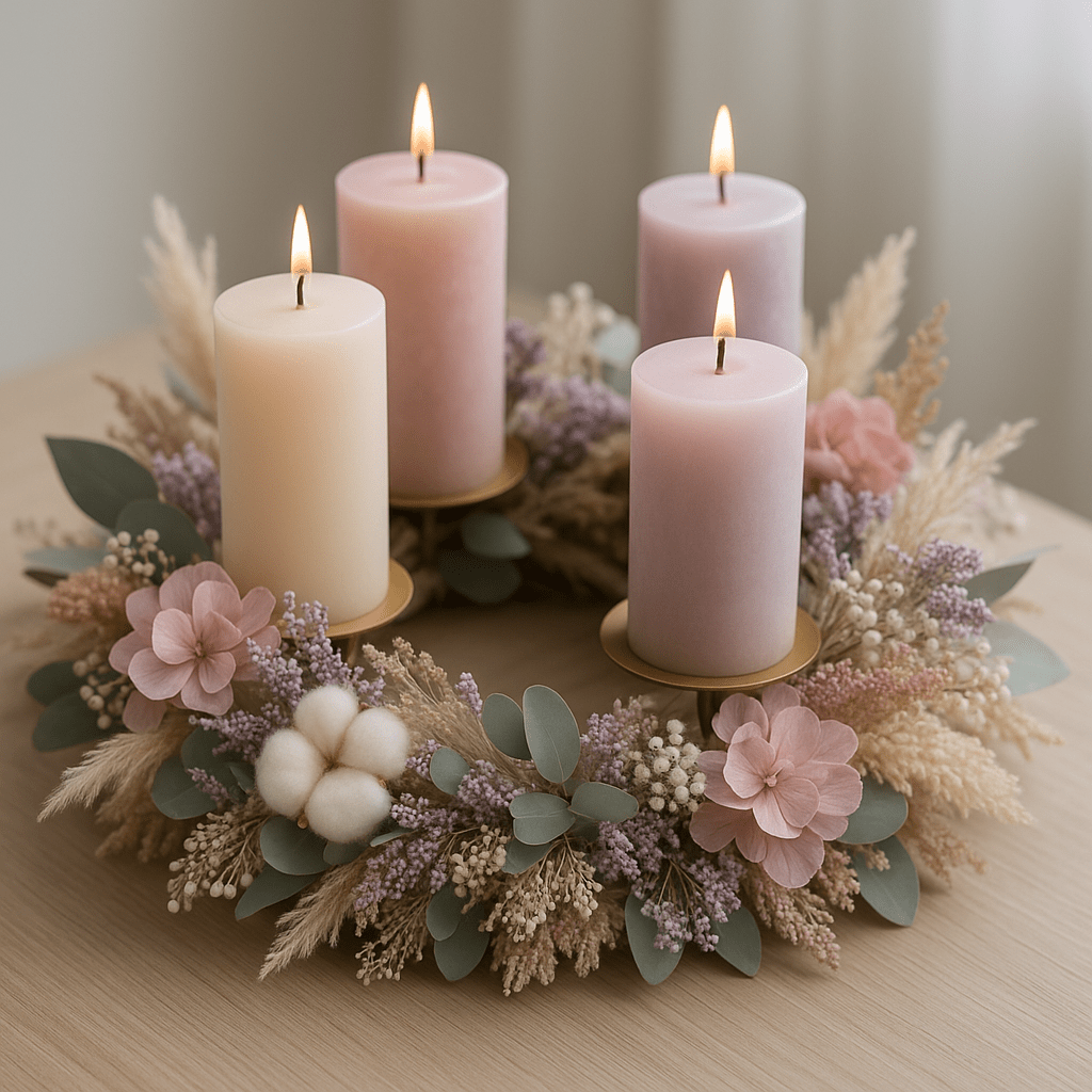 2025 sind Adventskränze mit Trockenblumen besonders beliebt, weil sie filigran aussehen und vor allem den Vorteil haben: Sie halten ewig! Du kannst so einen Kranz jedes Jahr wiederverwenden, einfach neue Kerzen drauf und fertig. ✨