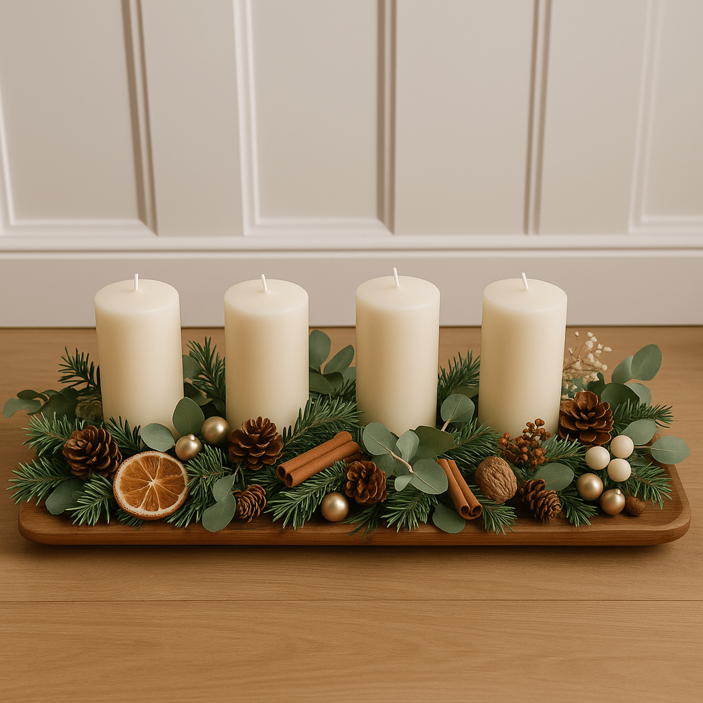 Die Basis bildet ein längliches Tablett, eine schmale Holzplatte oder ein rechteckiger Teller. Darauf platzierst du vier Kerzen nebeneinander, entweder alle in gleichen Abständen oder leicht versetzt.