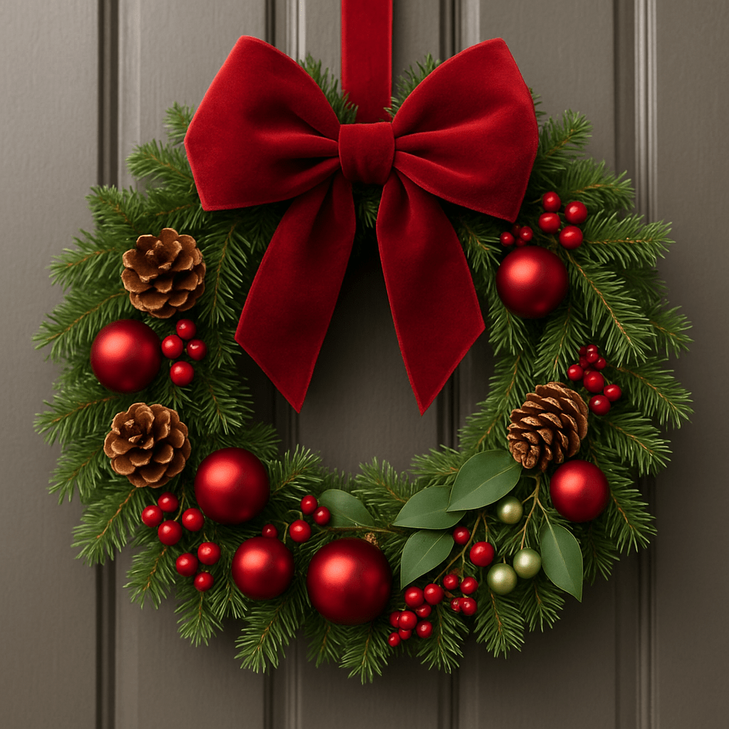 Das ist zwar streng genommen kein Adventskranz mit vier Kerzen, aber eine Dekoration, die wir 2025 überall sehen. Ob aus Tanne, Eukalyptus oder ganz modern aus Trockenblumen, Hauptsache weihnachtlich!