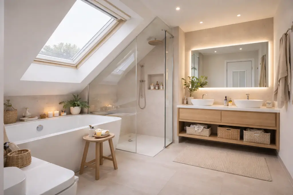Bäder unterm Dach können tricky sein, aber auch richtig charmant. Der wichtigste Punkt ist die Nutzung der Höhe. Bereiche, wo du stehen musst, gehören in die höchste Zone: Dusche, Waschbecken, Spiegel.