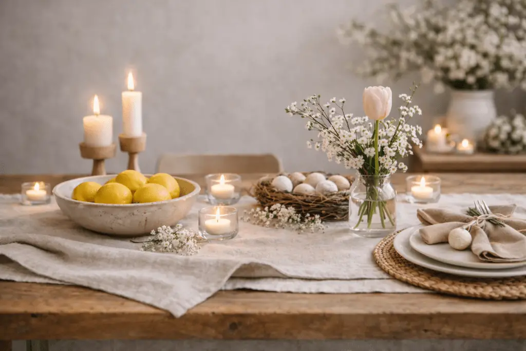 Die Kerzenfarben bleiben ruhig. Weiß, Creme oder ganz zarte Pastelltöne. Diese Tischdeko ist ideal für Abende, an denen es gemütlich sein soll. Das funktioniert hervorragend im Frühling, wenn es draußen länger hell bleibt und das Kerzenlicht sanft ergänzt.