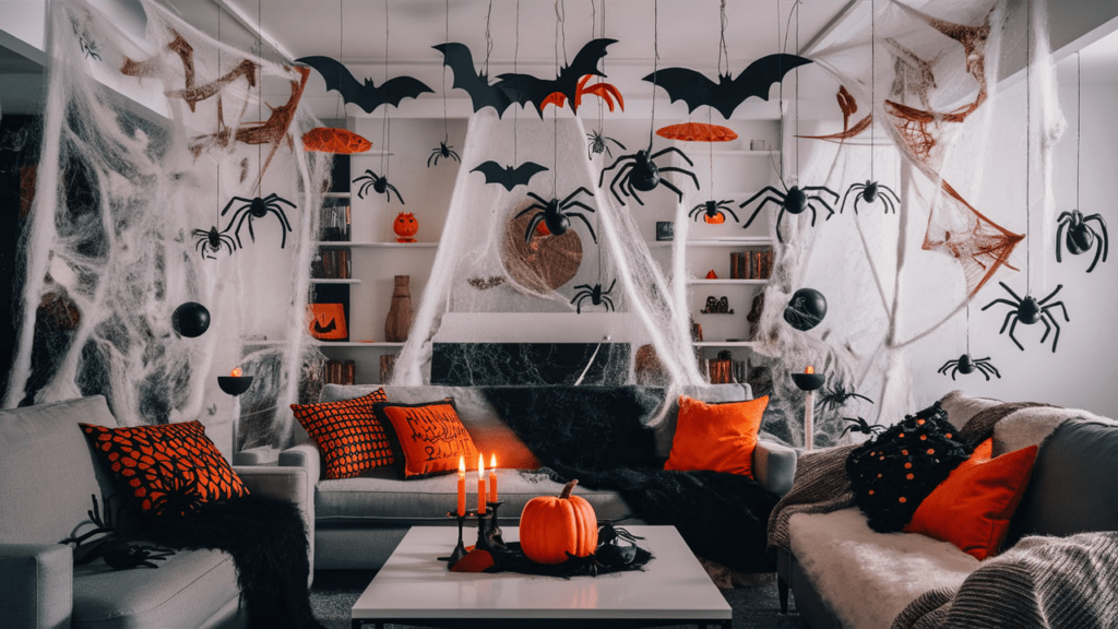 Was wäre ein Halloween ohne Spinnweben*? Diese lassen sich einfach an Ecken, Türen oder Möbeln befestigen und sorgen sofort für einen gruseligen Look. Kombiniere sie mit ein paar Plastikspinnen oder kleinen Fledermäusen*, die von der Decke baumeln. Du kannst auch selbst welche aus schwarzem Papier ausschneiden und an die Wände kleben.