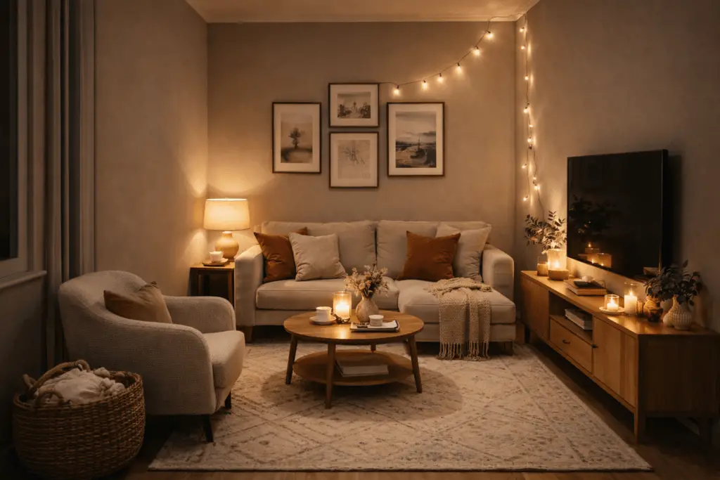 Kleines Wohnzimmer mit mehreren warmen Lichtquellen wie Steh- und Tischlampen, Kerzen und einer dezenten Lichterkette, die indirektes Licht erzeugen und dem Raum am Abend eine gemütliche, tiefe und einladende Atmosphäre verleihen.