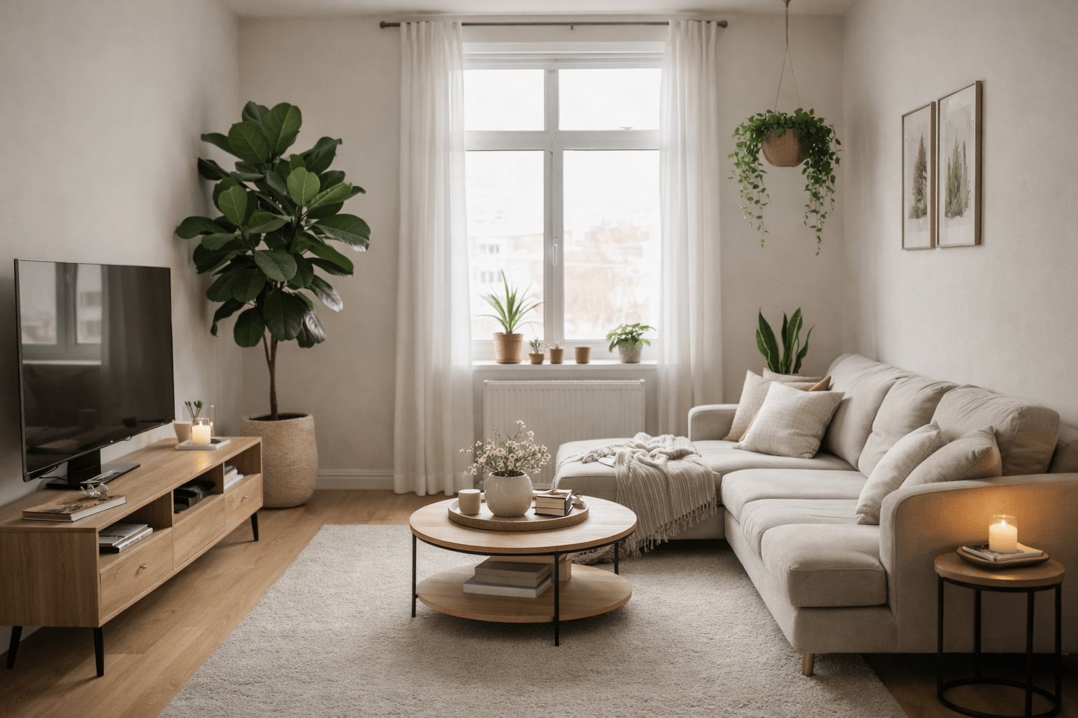 Kleines, schmal geschnittenes Wohnzimmer mit wandmontiertem Fernseher, der den Boden frei lässt, einem schlanken Sideboard darunter für zusätzlichen Stauraum, einem kompakten Sofa und hellen Naturtönen, wodurch der Raum aufgeräumt, strukturiert und größer wirkend erscheint.