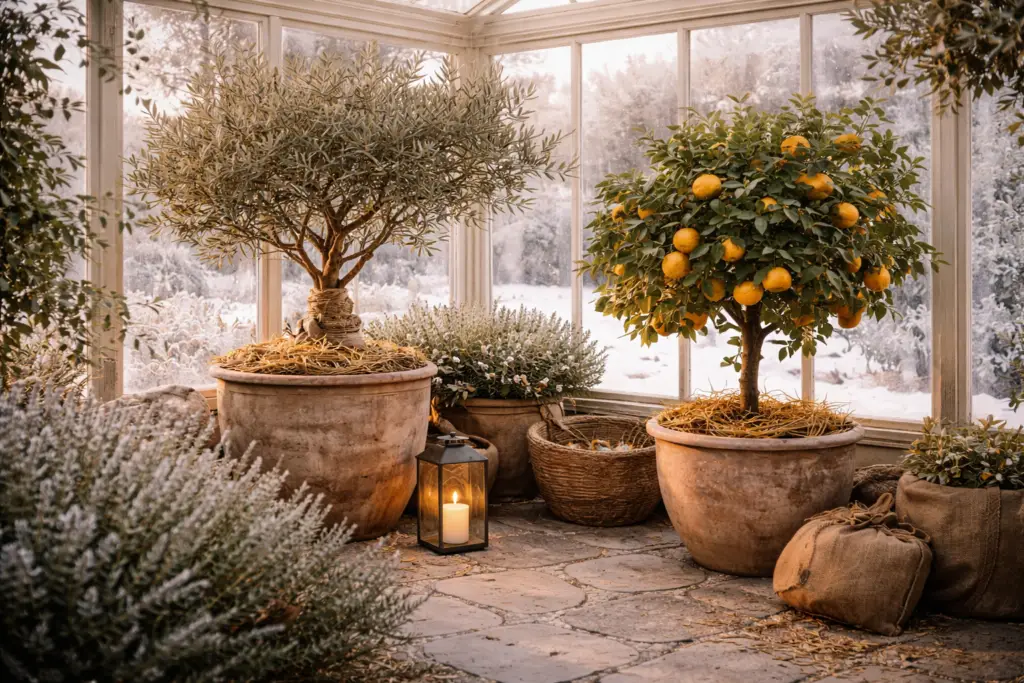 Eine kleine Zitronenpflanze (oder auch Kumquat oder Orange, je nach Vorliebe) sorgt für frisches Gelb oder Orange im Beet. Besonders cool ist eine robuste Ölweide, die wie ein kleiner Olivenbaum aussieht, aber oft winterhärter ist.