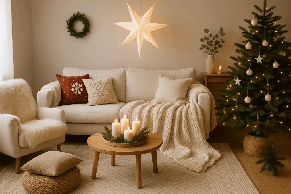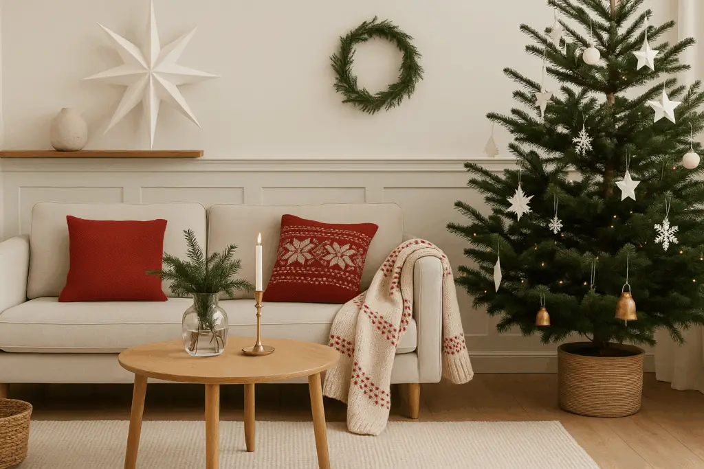 Klar, ein bisschen Rot und Grün darf sein, aber genau im richtigen Maß. Wie wäre es mit ein paar roten Kissenbezügen oder einer Strickdecke mit roten Mustern als Akzent? Wichtig ist, dass du dich für ein durchgängiges Farbschema entscheidest, damit alles harmonisch wirkt.