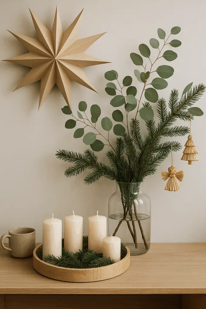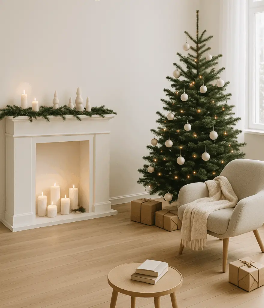 Den kannst du einfach mit Tannenzweigen, Kerzen und vielleicht zwei, drei schlichten Keramikfiguren verschönern. Der Rest des Raumes bleibt eher clean. Diese Balance aus festlich und klar ist typisch skandinavisch.
