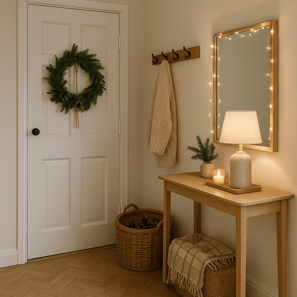 Auf der Kommode reicht eine schlichte Lampe mit warmem Licht, daneben ein kleines Tablett mit einem Windlicht und einem Mini-Tannenzweig. Voilà, der Flur wirkt einladend und weihnachtlich ohne Chaos.