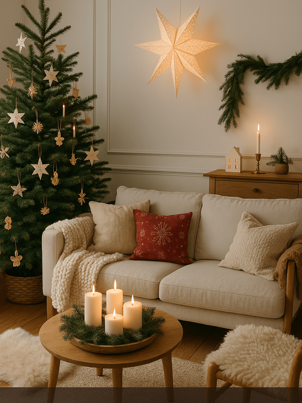 Setze also auf Deko und Möbel aus natürlichen Materialien. Zum Beispiel: ein großer Deko-Stern aus Papier im Fenster, ein Tablett aus hellem Holz als Adventskranz mit Kerzen, oder kleine Anhänger aus Stroh am Christbaum.
