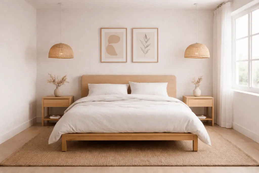 Skandinavisches Schlafzimmer mit hellem Holzbett, weißer Leinenbettwäsche und großer Pendelleuchte aus Naturmaterial, ruhig und modern eingerichtet in warmen Beigetönen.