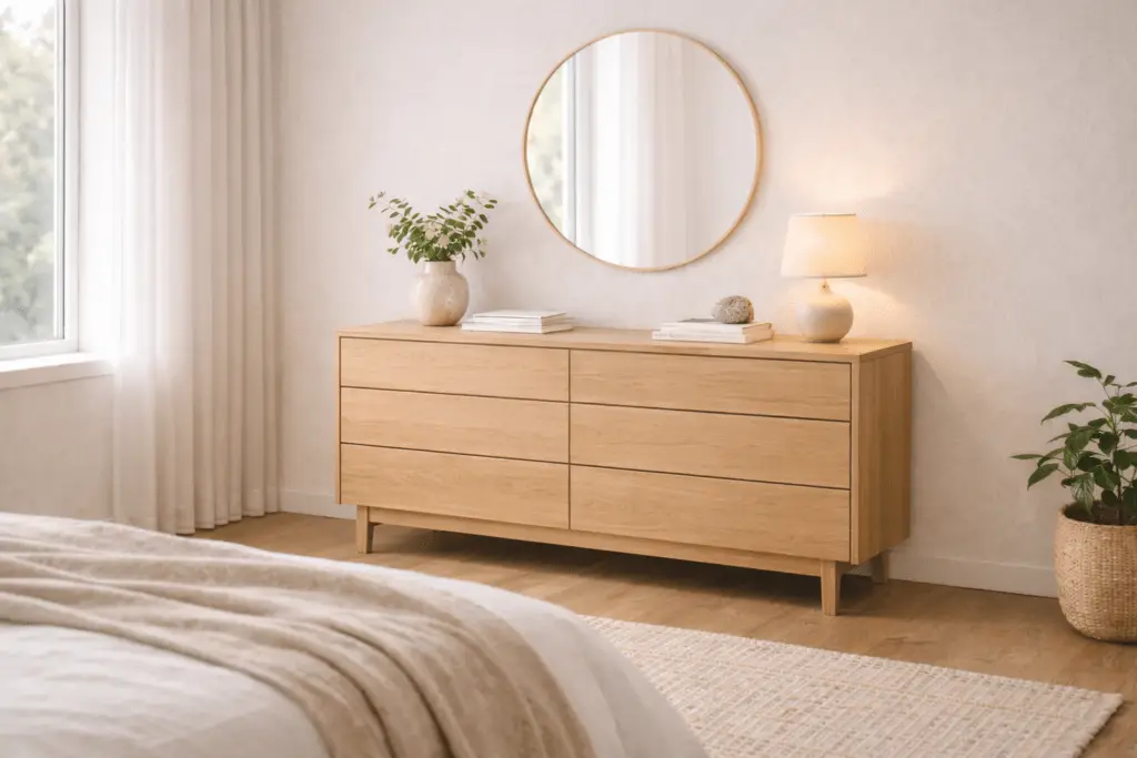Eine dezente Kommode ist nicht nur praktisch, sondern passt auch perfekt in dein skandinavisches Schlafzimmer. Helle Oberflächen und schlichte Formen sorgen dafür, dass sie sich perfekt in das Gesamtbild einfügt.
