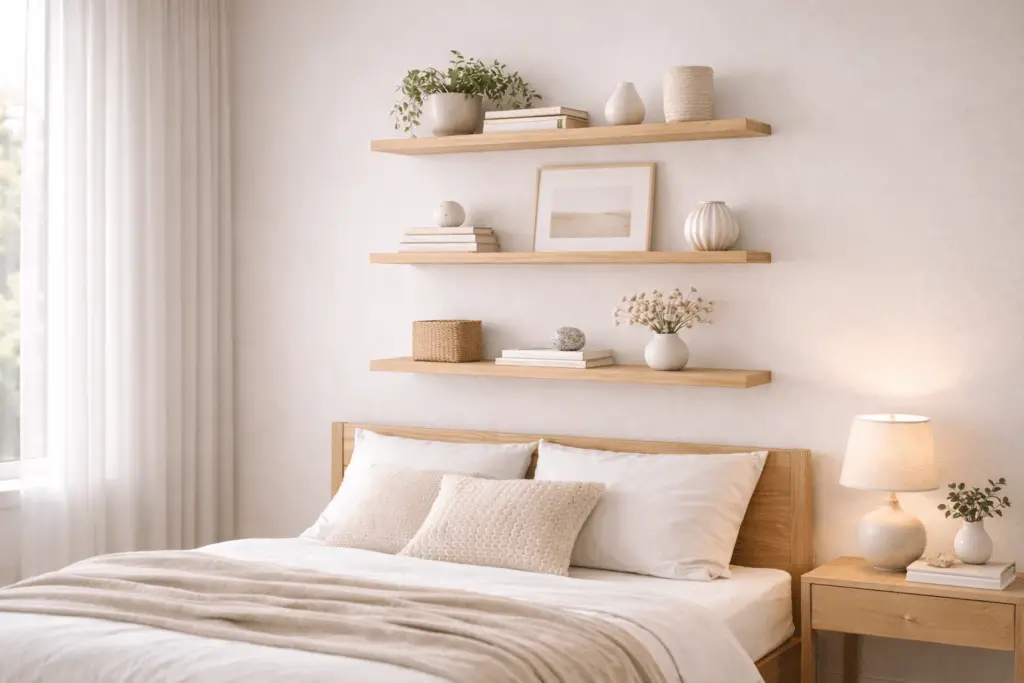 Offene Wandregale sind eine schöne Möglichkeit um Stauraum und Platz für Dekorationen zu schaffen. Helle Hölzer wie Birke oder Fichte wirken leicht und passen perfekt in dein skandinavisches Schlafzimmer.