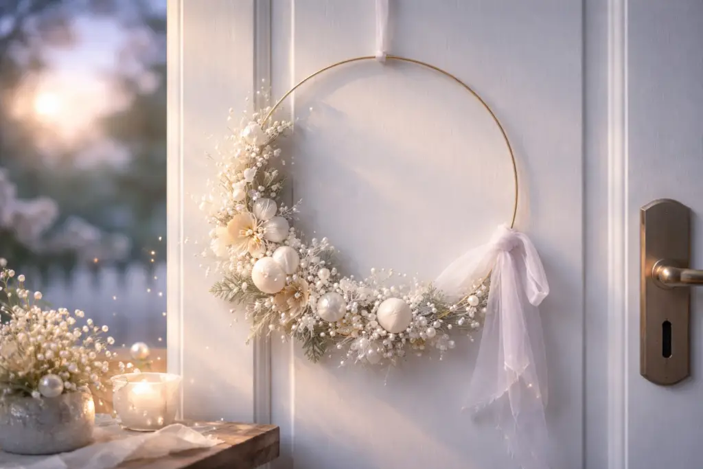 Genau so kannst du deinen Kranz bauen: Basis in Weiß, Perlen oder perlmuttige Elemente, ein paar kleine Sterne, vielleicht ein Band in sehr hellem Fliederton. Das wirkt wie Sommernacht, nicht wie Weihnachtsdeko in falsch.