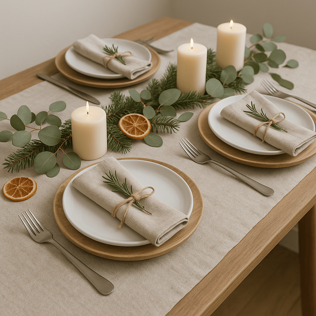 So geht’s: Lege eine Tischdecke oder einen Läufer in Naturtönen auf. Kombiniere schlichtes weißes Geschirr mit Untersetzern aus Holz oder Rattan. Als Highlight dienen Tannenzweige, Eukalyptus oder getrocknete Orangenscheiben als natürliche Streudeko.