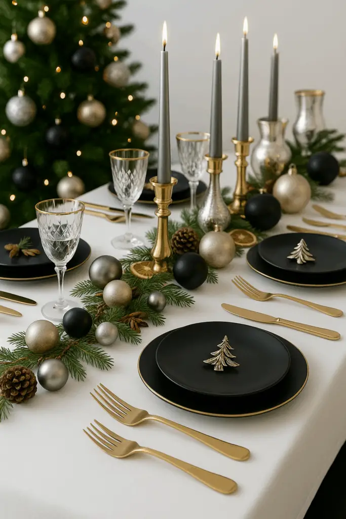 Mische Gold und Silber ruhig miteinander. Ein schlichter weißer Hintergrund (Tischdecke, Geschirr) lässt die glänzenden Details noch mehr strahlen.