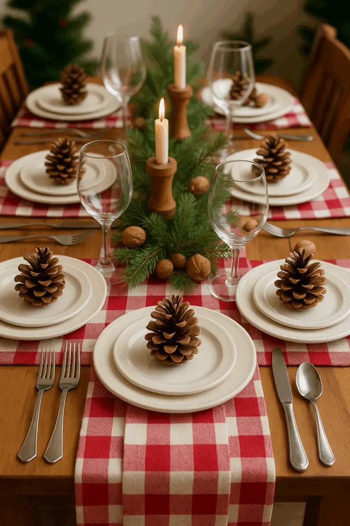 Eine rot-weiß karierte Tischdecke oder Läufer erinnert an traditionelle Weihnachten auf dem Lande. Das Muster lässt sich wunderbar mit Tannenzapfen, Holzkerzenhaltern und Leinenservietten kombinieren, wodurch ein nostalgisches Flair entsteht.