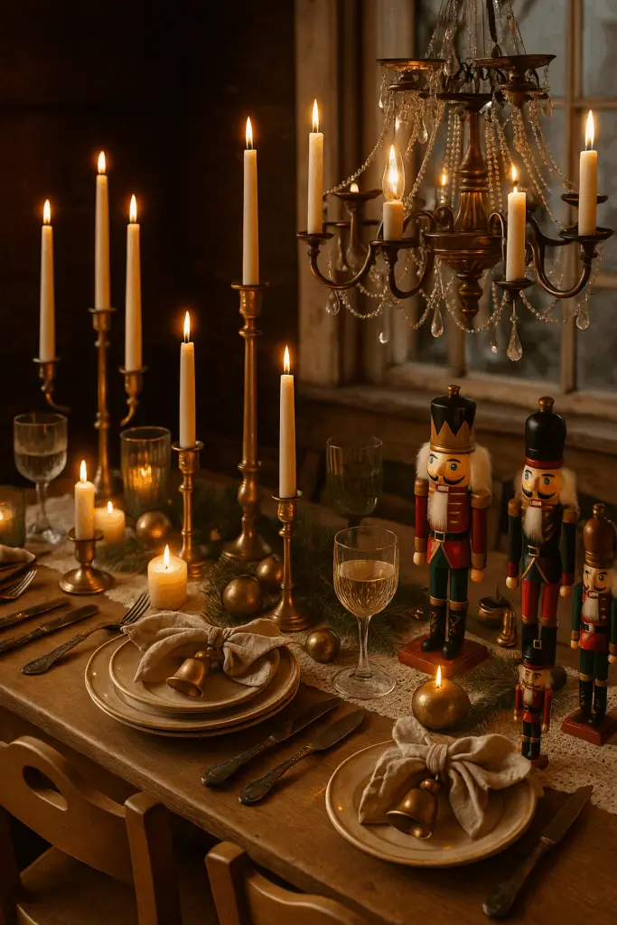 Nussknacker dürfen auch nicht fehlen. Farblich passen traditionelle Töne: viel Gold, Rot, Grün und Holz. Leichte Abnutzungsspuren sind hier kein Makel, sondern erwünscht für den Charme.