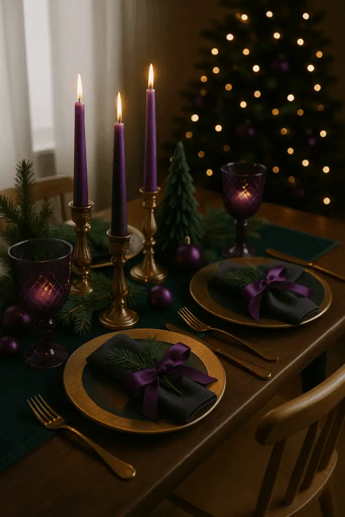 So geht’s: Nutze dunkelgrüne Elemente wie einen Tischläufer oder Stoffservietten. Kombiniere dazu violette Highlights wie zum Beispiel Glaskerzenhalter, lila Christbaumkugeln als Deko auf dem Tisch, oder violette Satinbänder um die Servietten.