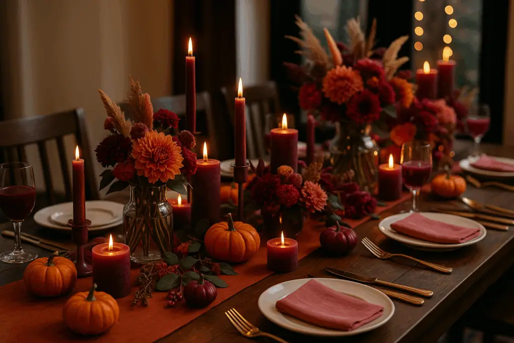 So geht’s: Wähle eine Palette aus 3–4 harmonierenden Herbstfarben z.B. Tiefrot, Rostorange, Altrosa und Pflaume. Diese ziehst du durch. Tischläufer in einem dunklen Orange, dazu Servietten in Rosé und Kerzen in Weinrot und Pflaume.
