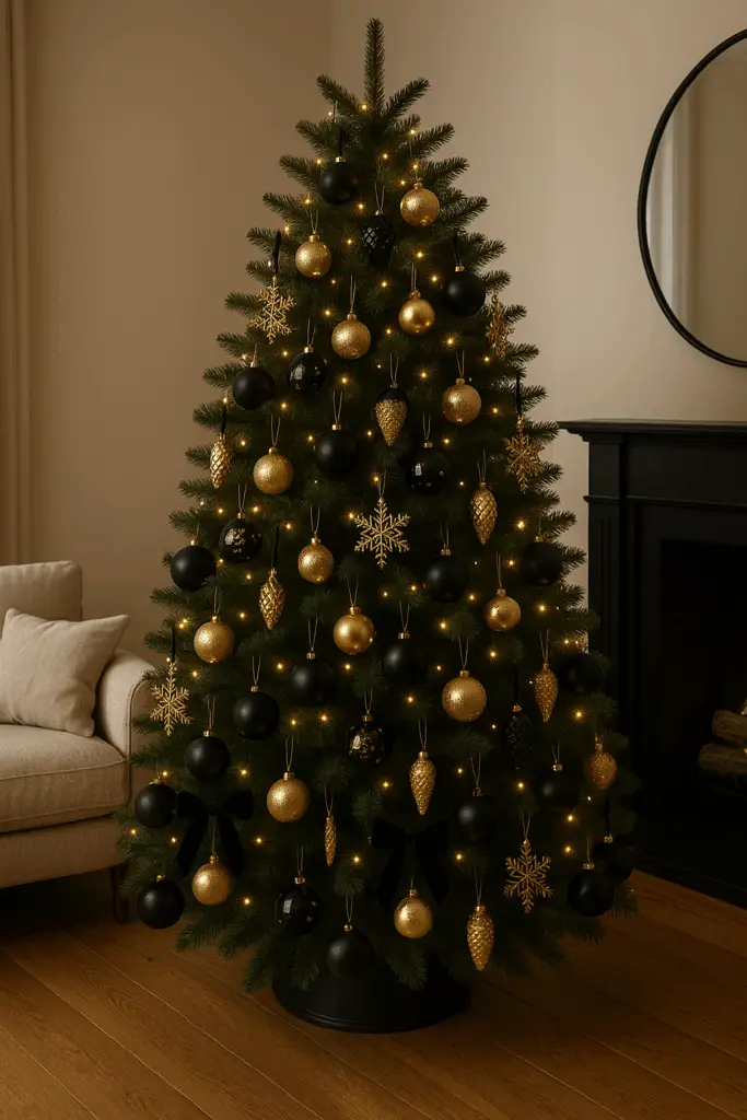 Deko Tipp: Setze auf Kontraste! Schmücke den Baum mit schwarzen Kugeln (gerne in mattem Finish und in glänzend) und füge goldene Highlights hinzu.