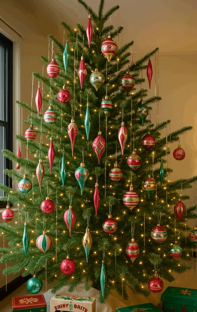 Kombiniere echte Vintage Schätze ruhig mit Neuware im Retro-Stil: Heutzutage gibt es viele Neuauflagen von 50er/60er-Jahre Baumschmuck.
