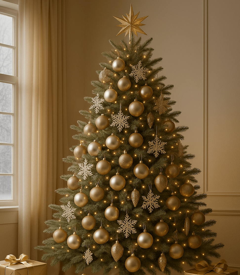 Der helle Goldton verleiht deinem Baum einen Hauch Luxus, ohne aufdringlich zu wirken. Warum dieser Look im Trend liegt? Champagner Nuancen schaffen eine festliche, aber sanfte Atmosphäre und passen perfekt zu modernen Interiors.